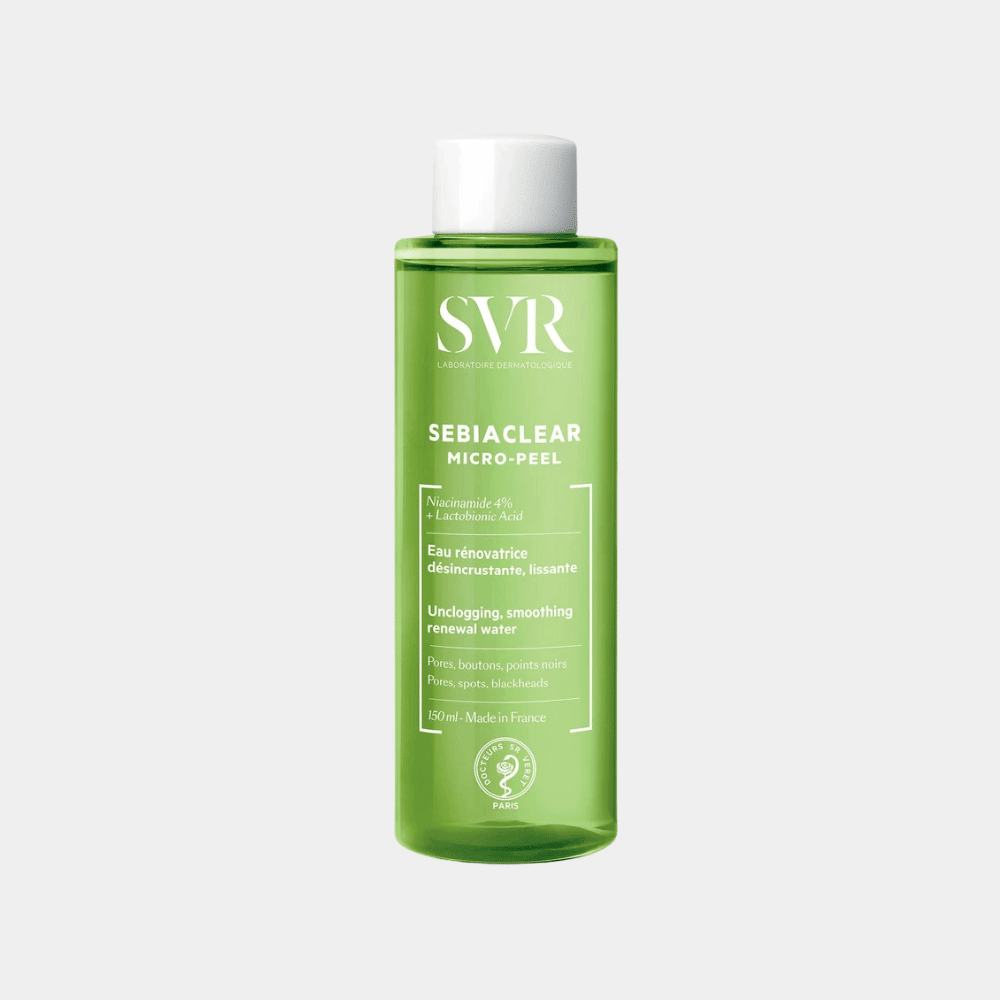 Sebiaclear Micro-Peel de SVR, un agua dermatológica con ingredientes activos como la Niacinamida, el Ácido salicílico y el Ácido lactobiónico, con acción antioxidante, seborreguladora, y exfoliante, que desobstruye poros y mejora la textura de la piel.